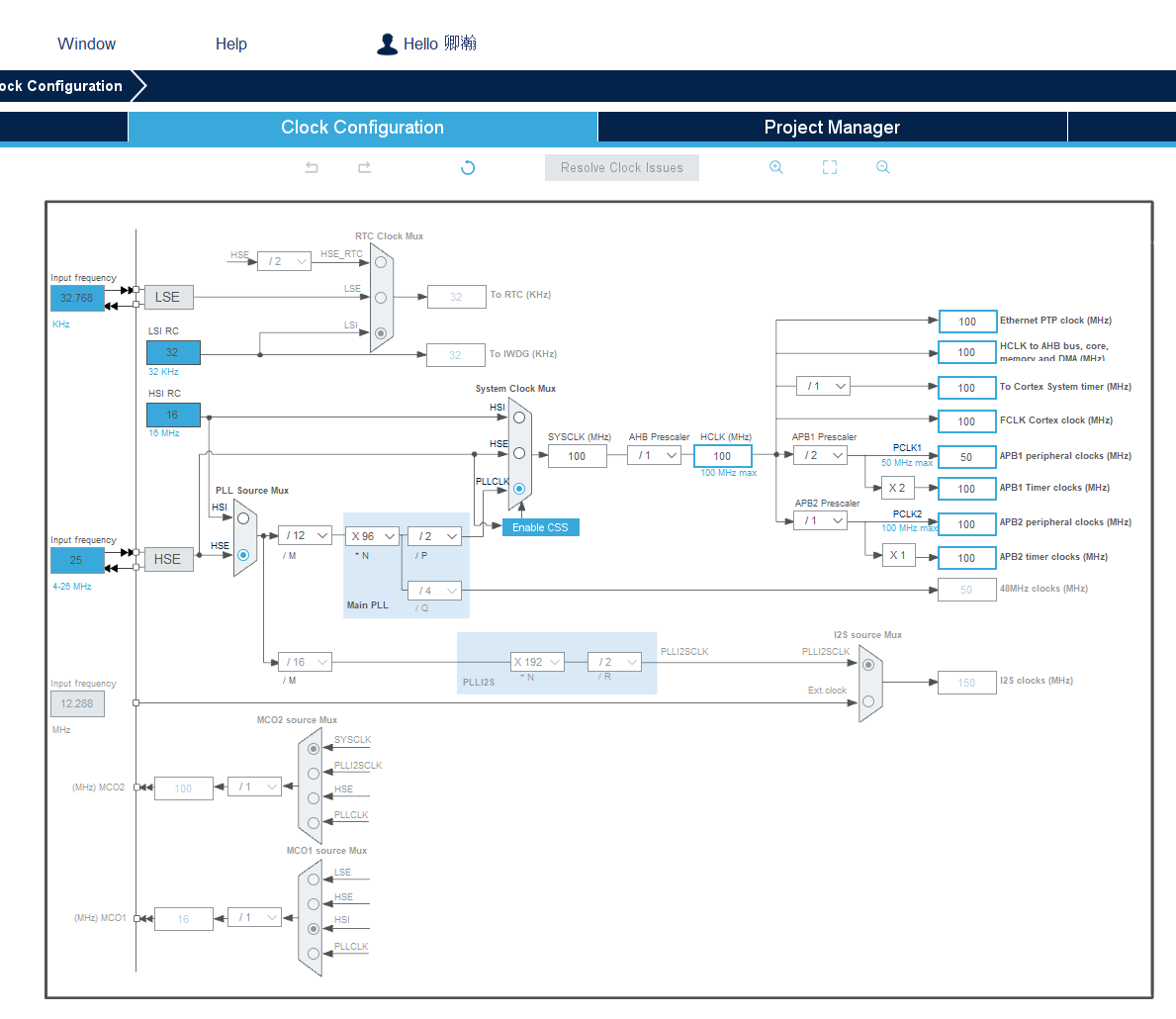 Clock Config, 可参考下图设置, 由原理图可知, 外部高速晶振接的25MHz,低速为32.768kHz. 按照填好, 然后设置分屏器, 使用PLL锁相环, 设置HCLK和SYSCLK为100MHz, 拉到最大.