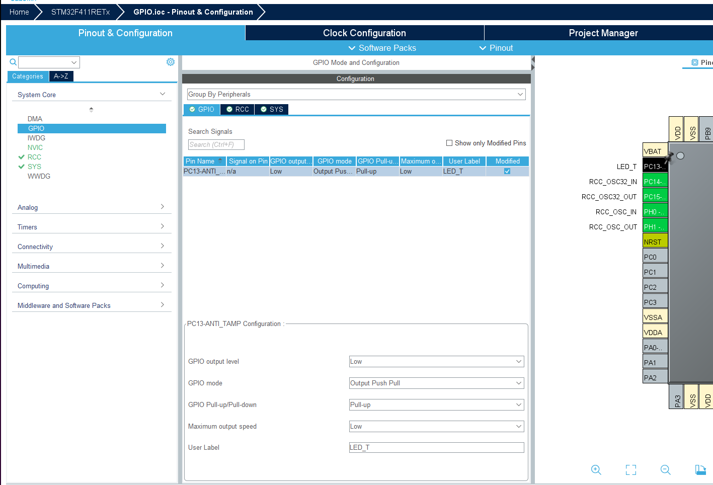 接着我们试下点灯, 使用GPIO, 可以看到LED测试的灯连接在PC13上,所以我们设置GPIO PC13为输出,然后等等测试点灯。