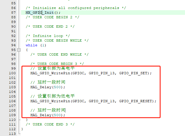 照顾到规范,我们在BEGIN和END之间,添加上GPIO置1和置0,然后添加上delay函数延时,编译烧录测试,这样就实现了LED灯的翻转了~ 是不是很便捷呢~~
