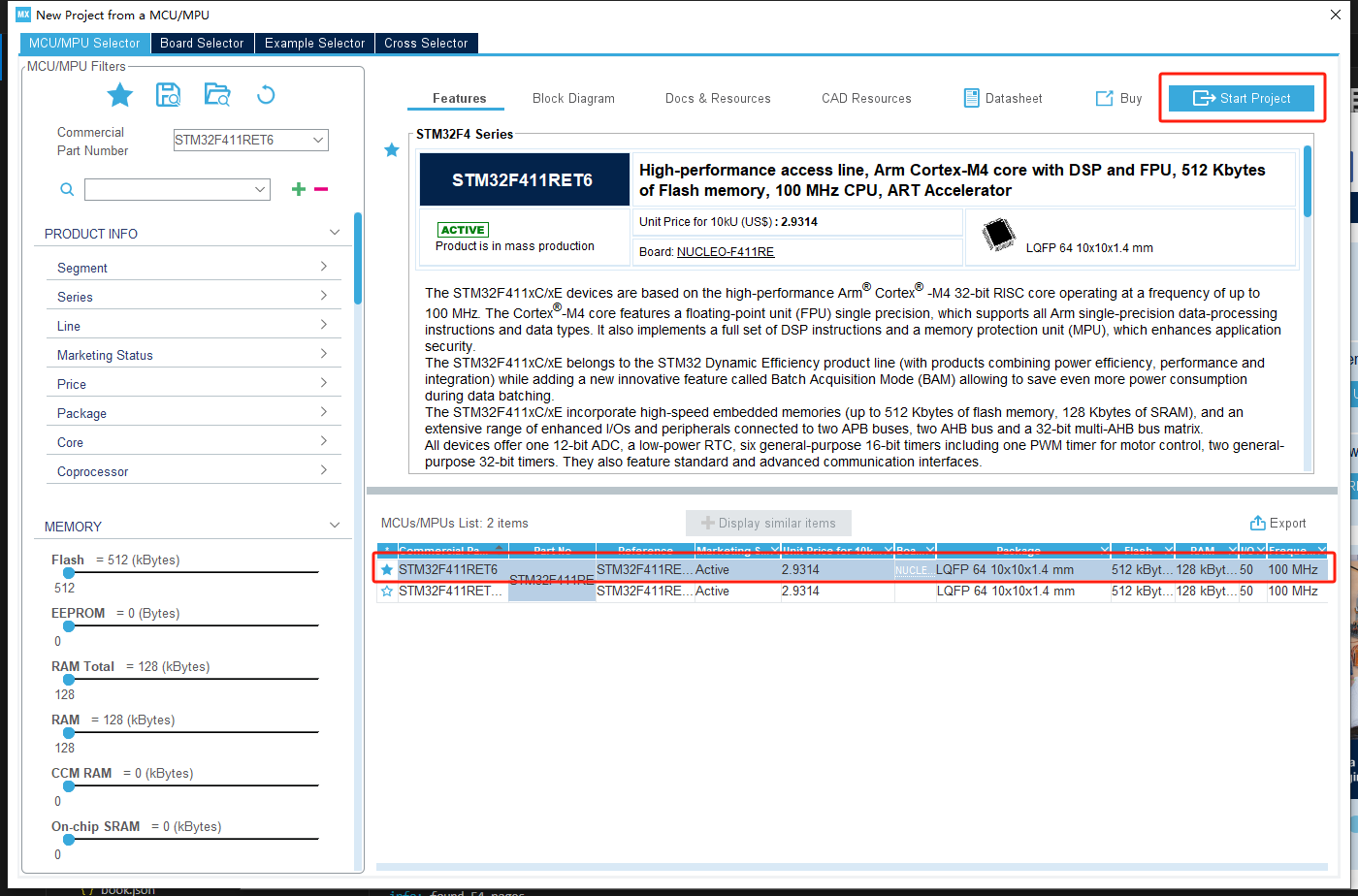 STM32F411RET6, 然后点击Start Project进入工程设置.