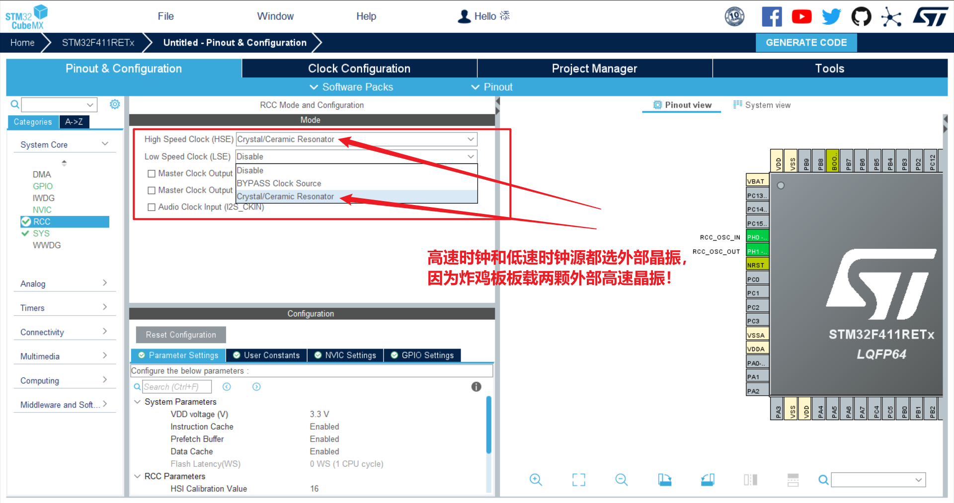 设置RCC. 这里FryPi炸鸡派开发板的外设是有外部晶振的,所以高速和低速CLK都使用外部晶振作为源.