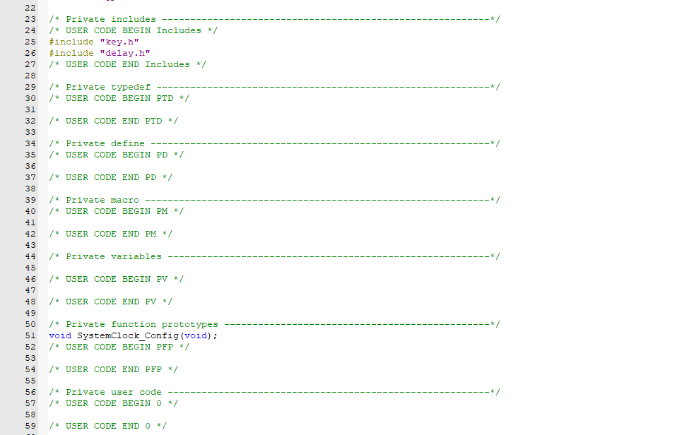 打开keil工程,可以发现里面很多注释,USER CODE BEGIN什么的,这个他是为了用于让用户在BEGIN和END之间加自己的代码,然后写完代码再次使用CubeMX生成代码,就不会被覆盖,确实注释有点多,而且再次生成代码会有可能让项目混乱。