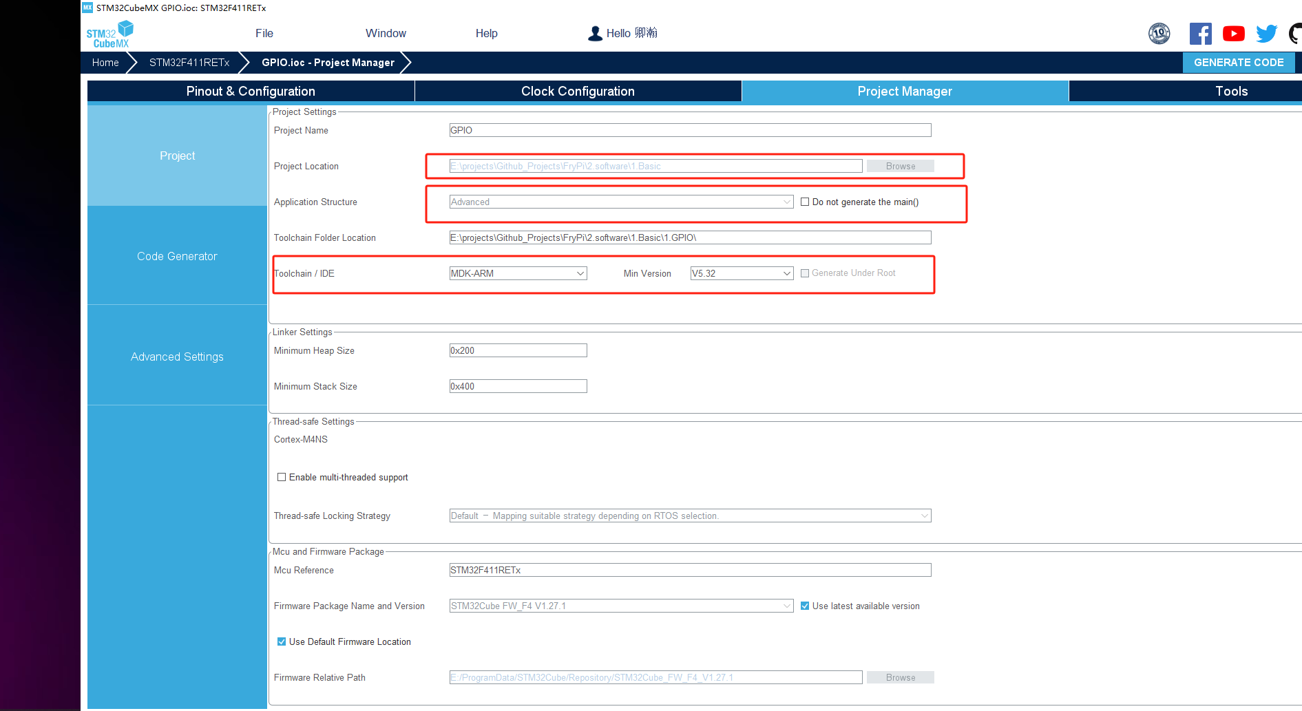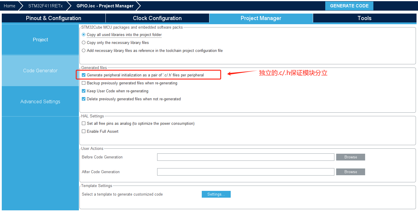 Project Manager, 可参考下图设置, 设置好导出路径, 设置好工程使用MDK, 然后点击右上角GNERATE CODE生成工程即可. 可以设置独立的.c/.h以保证项目的清爽,不会全部放在一起.