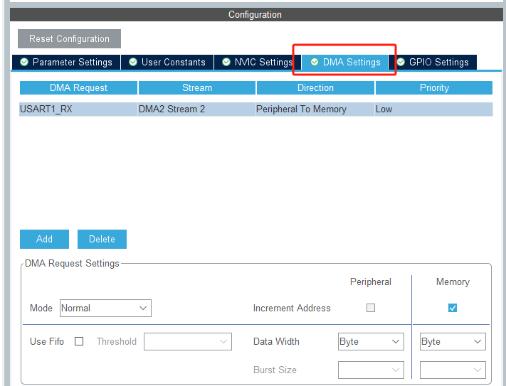 其他设置按照前文教的设置,然后我们再设置一下串口设置,波特率啥的都设置好,前期先按照我的模板,后续你们自己发挥。注意设置NVIC中断向量,使能串口中断,以及DMA设置,因为我们等等会用到串口不定长空闲中断,实现不定长发送信息这种操作,比较实用,我们的手表项目中也使用到了这种操作。