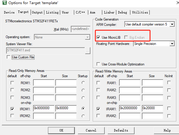 首先为了方便打印, 我们将常用的printf重定向到串口1,在usart.c中最后加入一个fputc重定向, 然后打开Use MicroLIB.