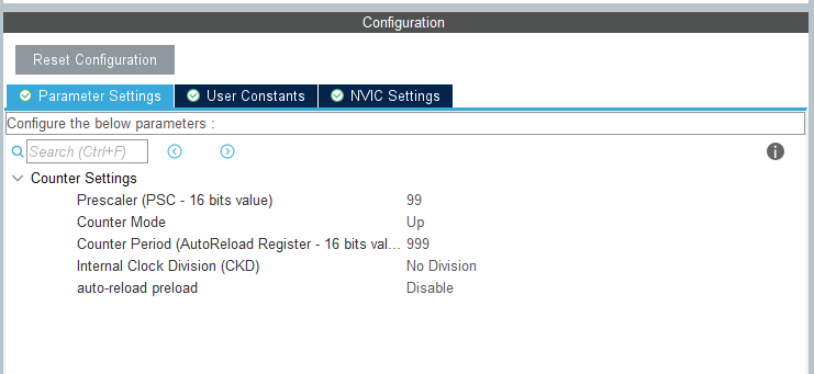 - 设定计数为UP向上计数, 计数1000, 即counter period为1000-1=999.