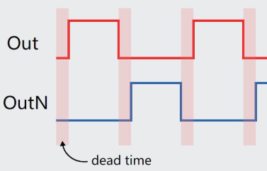PWM的死区是指在PWM信号的上下半桥开关之间插入的延迟时间,以避免功率元件在开关过程中同时导通,从而防止设备损坏。这里多用于数字电源中的MOS管桥臂的GS端的信号给定,上下管需要互补且带死区防止直通。