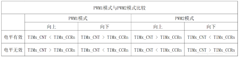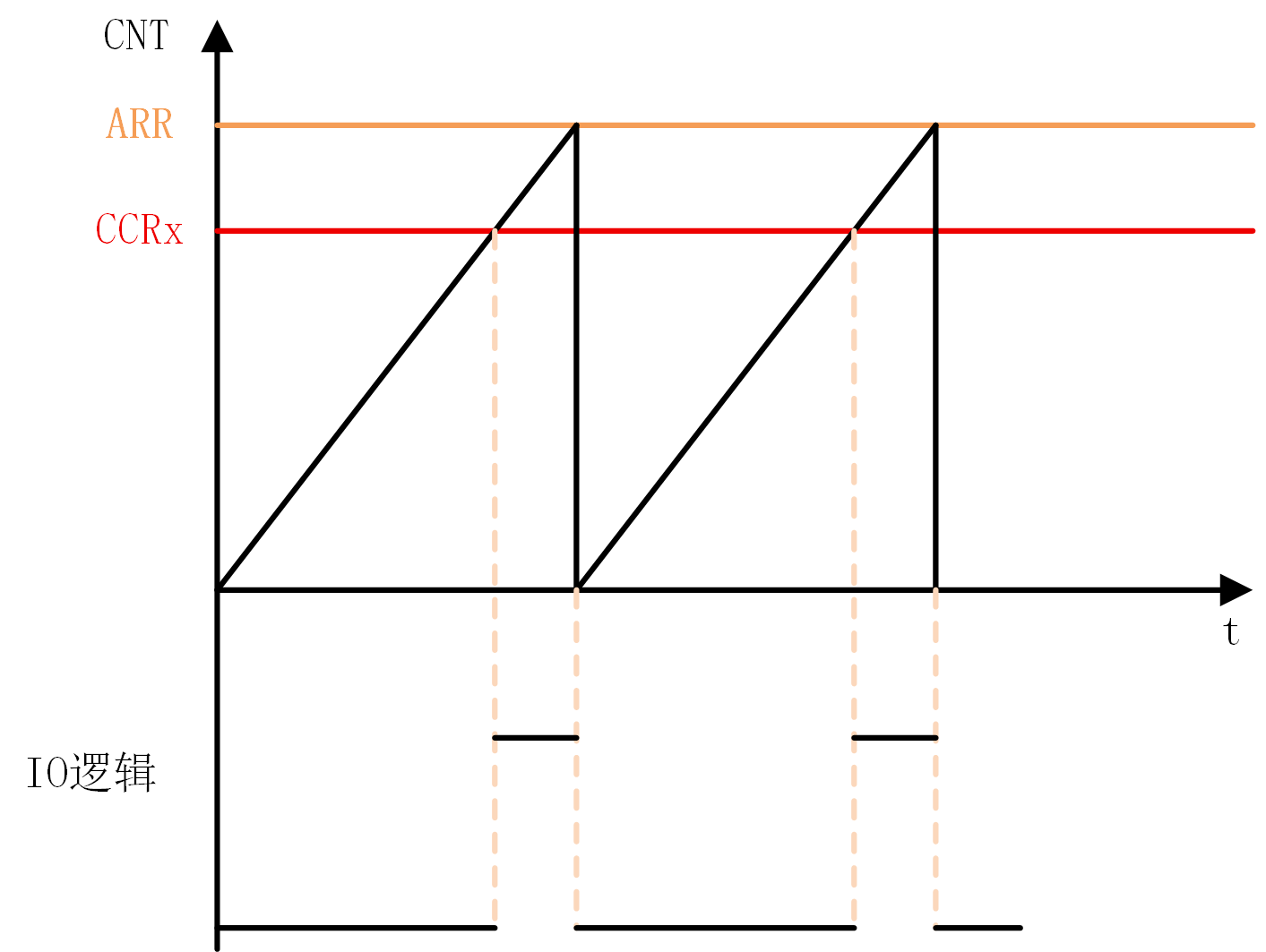 以PWM2低电平有效模式+向上计数模式为例,CNT为直角梯形,当 CNT < CCR 时,输出低电平;而当 CNT > CCR 时输出高电平。
