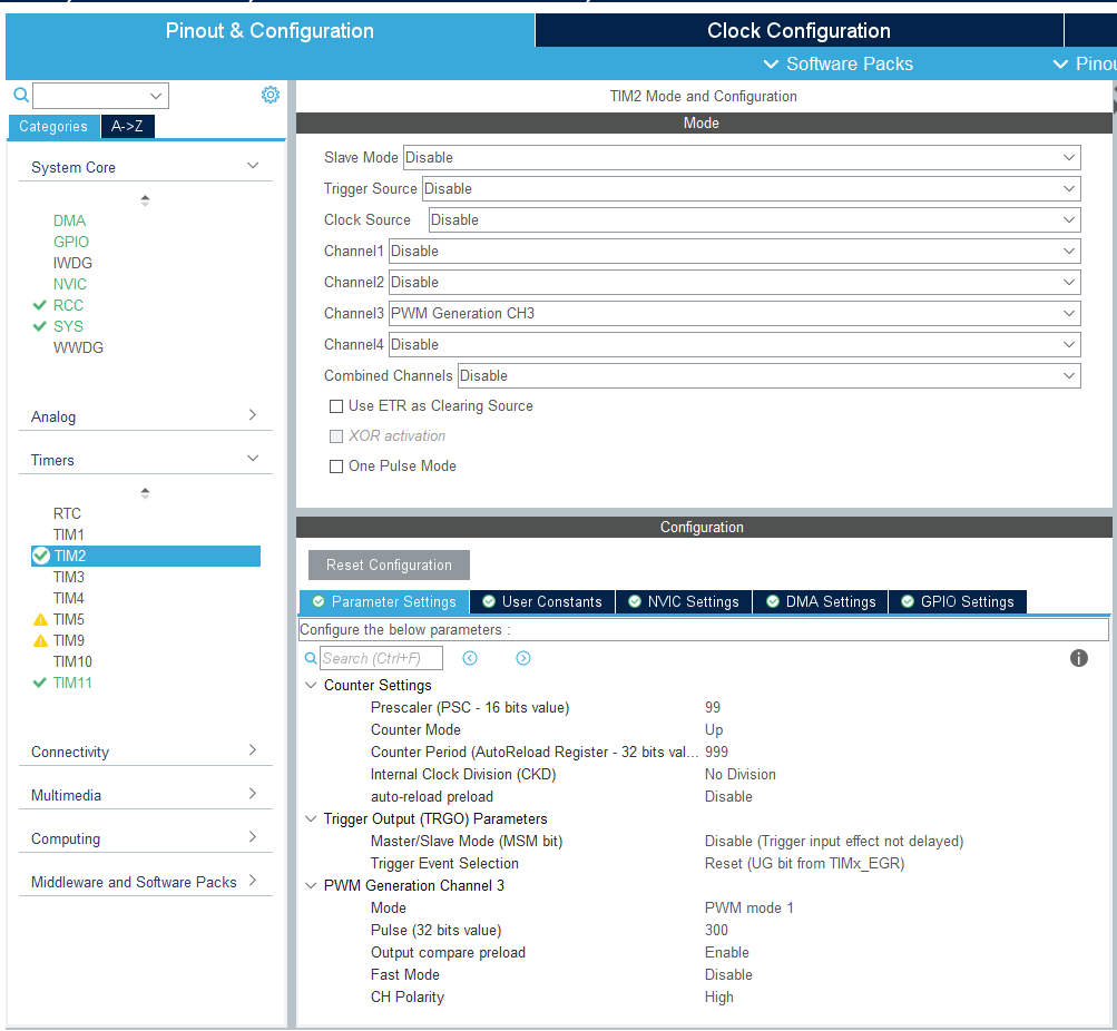 cubemx的设置如下,这里设置了TIM2 PWM CH3输出, 对应了引脚PA2, 然后解释一下CubeMX的设置参数: