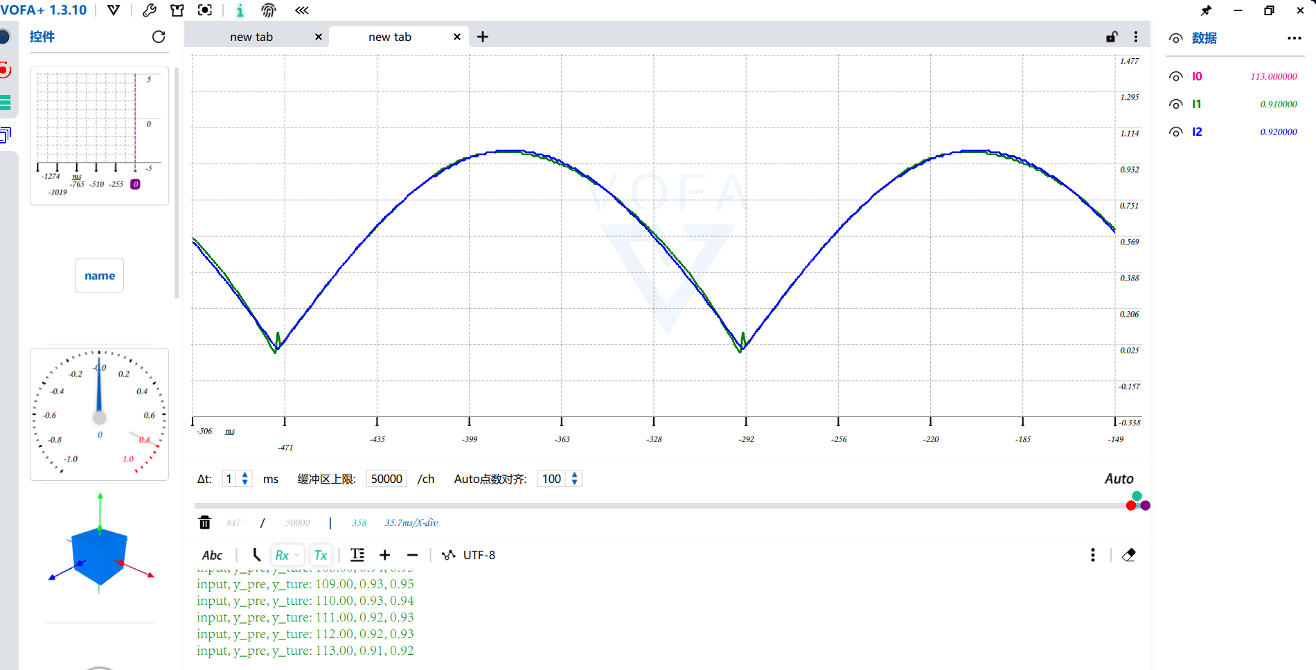 }后处理,我们将数组的结果输出出来,然后去vofa看看输出的y与真实的sin(x)是否拟合比较好。